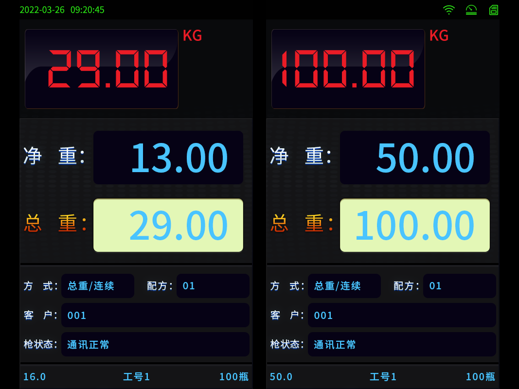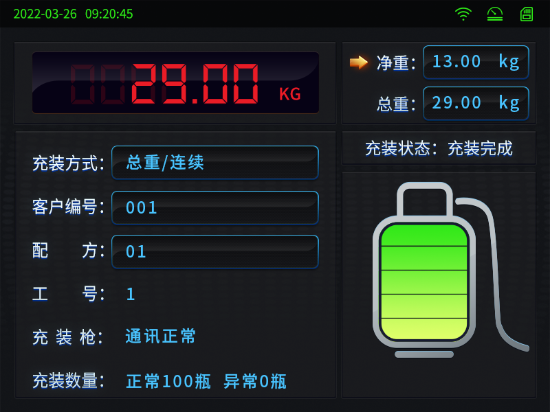 2、四种充装方式:净重/单次、净重/连续、总重/单次、总重/连续。